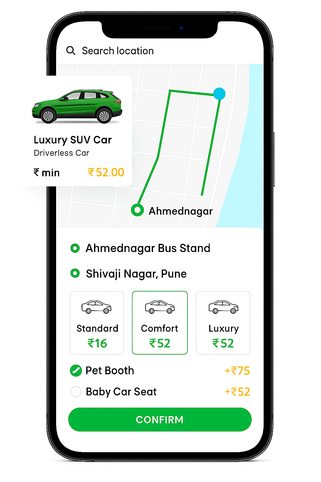 Book your ride with no advance payment. Pay directly to the driver once your journey is complete. Choose your preferred payment mode — UPI, GPay, Card, or Cash. Enjoy hassle-free booking and smooth rides every time.